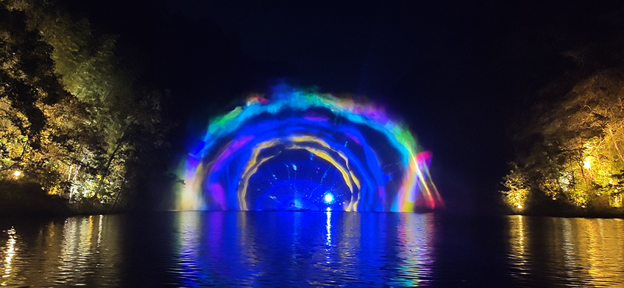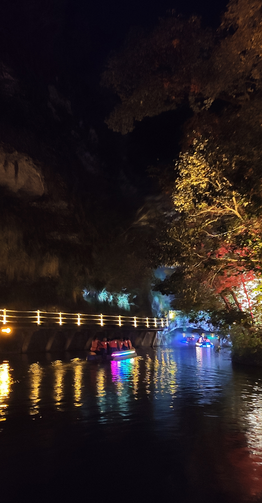 入夜,黨支部一行來到本次文旅最精彩的項目:“夜游九龍?zhí)?rdquo;。以“夜游九龍?zhí)?,靜享夜的美”為主題的“行進式”水上峽谷夜游景區(qū),利用現(xiàn)代化聲光技術(shù)與景區(qū)自然美景有機融合,讓您充分感受“詩意山水,光影幻境”。聽蛙唱蟲奏,觀月下仙境,月光映水,水波映月,加上臨水棧道邊笛聲陣陣......讓您真切的領(lǐng)會空靈、幽靜、夢幻的別樣意境。一路的聲光風(fēng)景讓人目不暇接,如果不是身臨其境,絕對感受不到那光影與大自然結(jié)合產(chǎn)生的絕妙意境。