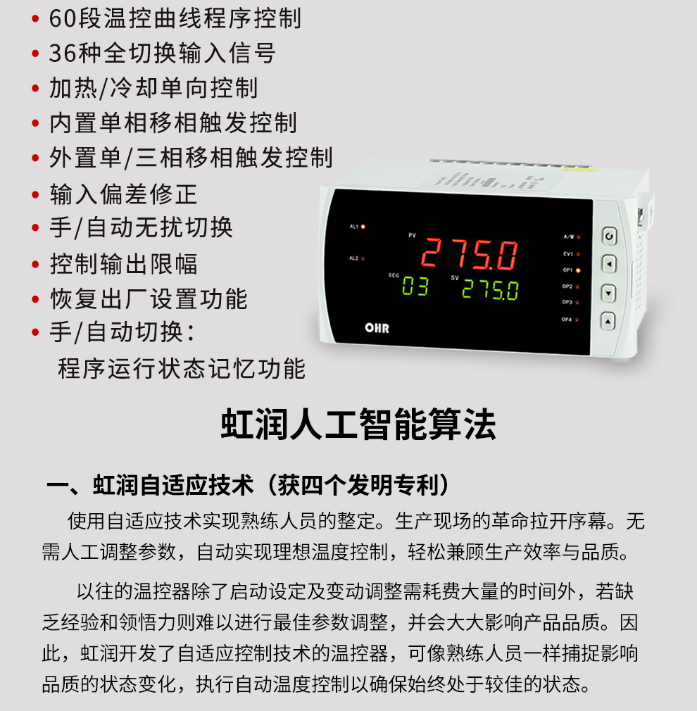 虹潤公司是專業生產溫控器的國家專精特新“小巨人”企業。生產的程序段智能溫控器,具有真正人工智能算式,無需人工整定參數,控制精度可達±0.1°C,60段溫控曲線程序,無超調、欠調等特點。產品獲得模糊PID控制儀及控制方法、人工智能調節器、智能化控制器、移相觸發控制器、閥門自動手動無擾動操作控制方法及裝置等5項國家發明專利,主持起草智能溫度儀表通用技術條件、工業過程控制系統用模擬輸入兩位或多位輸出儀表、工業過程測量和控制系統用智能調節器等3項國家標準,,以及通信系統多通道數據采集控制終端規范軍用標準,參與國際5G標準制定,取得60段PID自整定調節器等3項相關軟件著作權。產品廣泛應用于電力、石化,冶金、制藥、食品等幾乎所有工業現場,實現精準控溫,保障生產安全與質量。