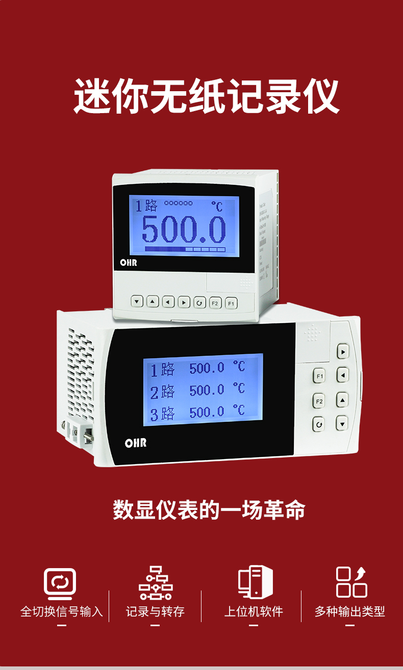 OHR-F100R系列無紙記錄儀集顯示、控制、記錄、遠傳等多種功能于一身,可以采集、保存、分析各種工業過程中的重要數據,主要應用在冶金、石油、化工、建材、造紙、食品、制藥等各種工業現場。