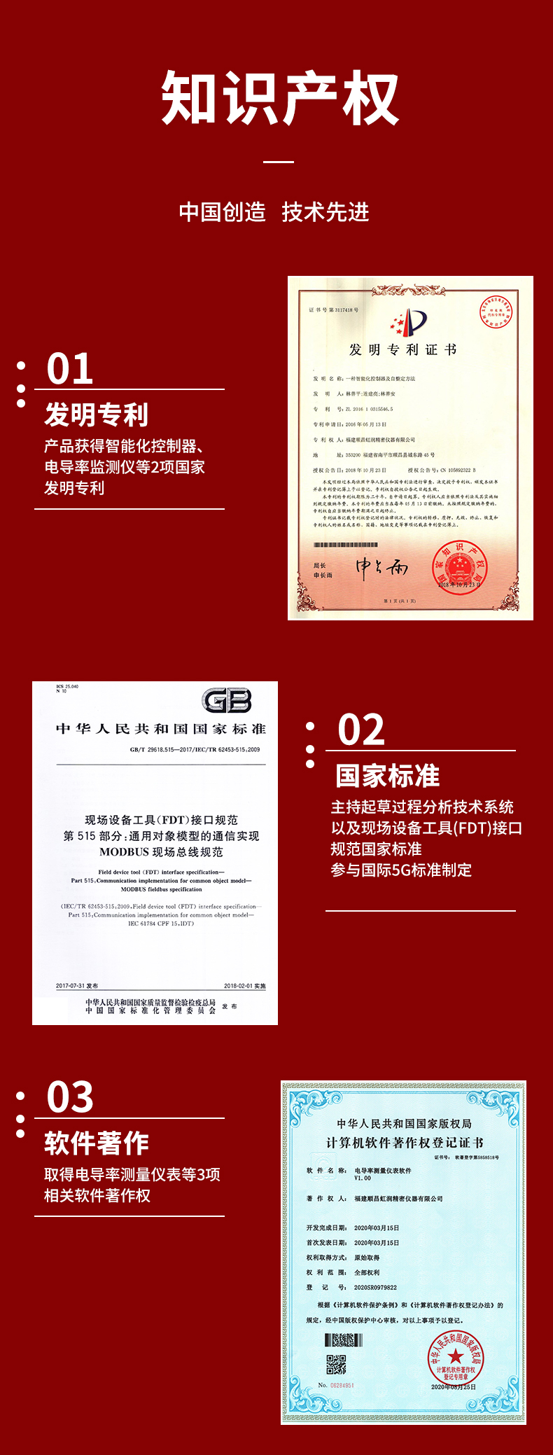 虹潤公司是專業生產水質分析儀的國家專精特新“小巨人”企業。生產的電導率在線監測儀,具有多元化安裝方式,IP65防護等級,多種類型輸出,測量穩定不跳字,變送輸出精準等特點。產品獲得智能化控制器、卡扣式安裝的儀表機殼等2項國家發明專利;主持起草現場設備工具(FDT)接口規范.,工業過程控制系統用模擬輸入兩位或多位輸出儀表、過程分析技術系統等3項國家標準;參與國際5G標準制定,取得電導率測量儀表等2項相關軟件著作權。產品廣泛應用于實驗室、水處理、環境監測、食品、制藥、農業等諸多領域。