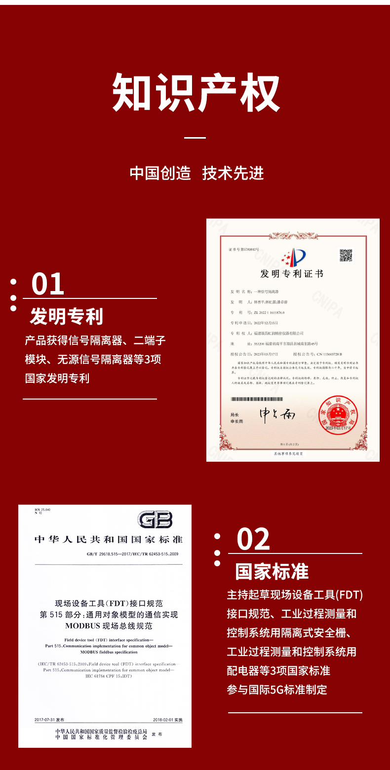 虹潤公司是專業生產隔離器的國家專精特新“小巨人”企業。生產的信號隔離器,具有采用磁隔離技術,直流電壓/電流輸入,響應時間快,抗干擾能力強,性價比高等特點。該產品不僅通過德國萊茵 CE 認證與 SIL 功能安全認證,還獲得信號隔離器、二端子模塊、無源信號隔離器等3項國家發明專利,主持起草現場設備工具(FDT)接口規范、工業過程測量和控制系統用隔離式安全柵、工業過程測量和控制系統用配電器等3項國家標準,參與國際5G標準制定。產品廣泛應用于石油、電力、化工,冶金、制藥、污水處理、窯爐控制等各種需要電隔離的工業現場。
