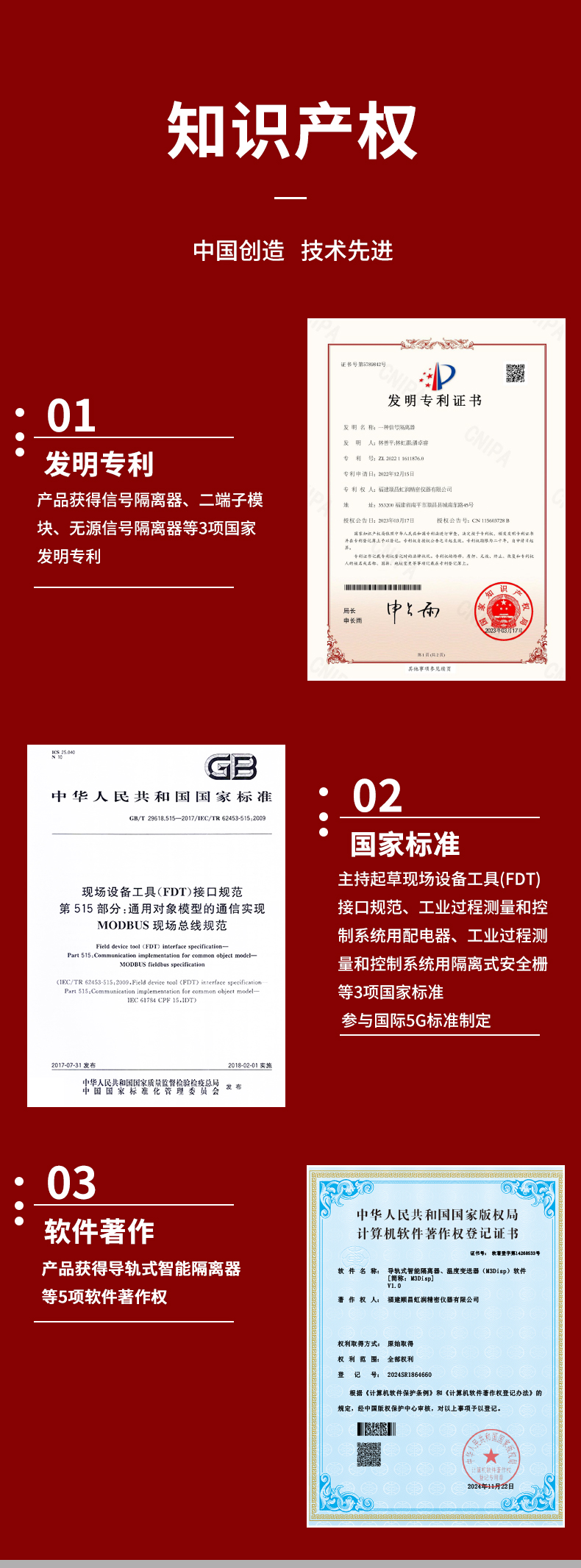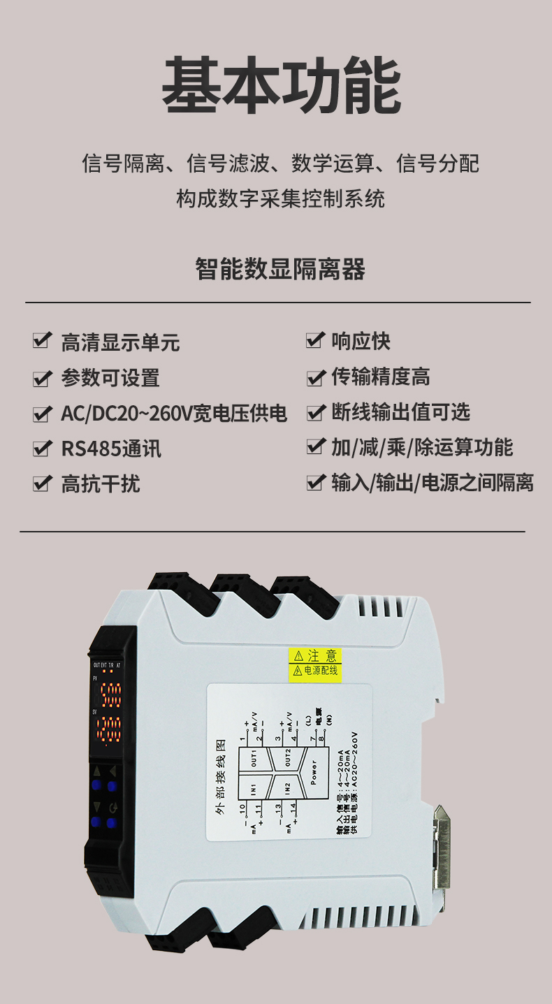 虹潤(rùn)公司是專業(yè)生產(chǎn)隔離器的國(guó)家專精特新“小巨人”企業(yè)。生產(chǎn)的智能數(shù)顯隔離器 ,具有高清顯示單元,參數(shù)可設(shè)置,寬電源供電,響應(yīng)快,帶RS485通訊等特點(diǎn)。產(chǎn)品獲得信號(hào)隔離器、一種二端子模塊、無(wú)源信號(hào)隔離器等3項(xiàng)國(guó)家發(fā)明專利,主持起草現(xiàn)場(chǎng)設(shè)備工具(FDT)接口規(guī)范、工業(yè)過(guò)程測(cè)量和控制系統(tǒng)用隔離式安全柵、工業(yè)過(guò)程測(cè)量和控制系統(tǒng)用配電器等3項(xiàng)國(guó)家標(biāo)準(zhǔn),參與國(guó)際5G標(biāo)準(zhǔn)制定,取得智能隔離器等2項(xiàng)相關(guān)軟件著作權(quán)。產(chǎn)品廣泛應(yīng)用于電力、石化,冶金、制藥、水處理、機(jī)械配套等各種工業(yè)現(xiàn)場(chǎng)。