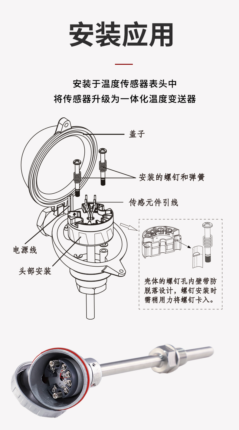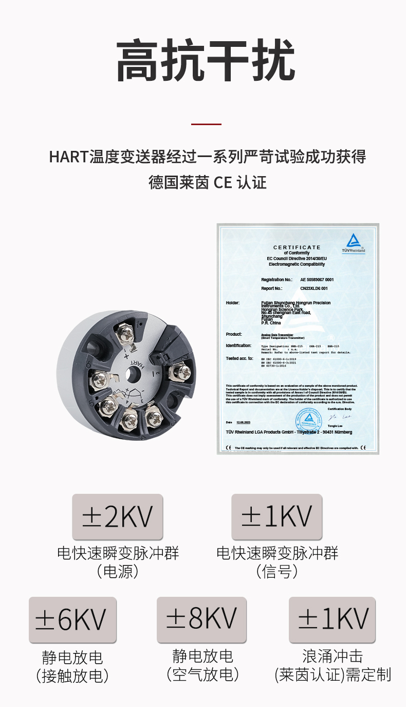 虹潤(rùn)公司是專(zhuān)業(yè)生產(chǎn)溫度變送器的國(guó)家專(zhuān)精特新“小巨人”企業(yè)。生產(chǎn)的智能數(shù)顯溫度變送器,具有適配各類(lèi)溫度傳感器,精度高,通過(guò)編程線修改輸入信號(hào)類(lèi)型及量程,高抗干擾,HART或485通訊等特點(diǎn)。該產(chǎn)品不僅通過(guò)HART基金會(huì)認(rèn)證、德國(guó)萊茵 CE 認(rèn)證與 SIL 功能安全認(rèn)證,還獲得具備減震抗干擾能力的溫度變送器、信號(hào)隔離器、一種二端子模塊、無(wú)源信號(hào)隔離器等4項(xiàng)國(guó)家發(fā)明專(zhuān)利,主持起草物聯(lián)網(wǎng)智能溫度儀表、現(xiàn)場(chǎng)設(shè)備工具(FDT)接口規(guī)范、工業(yè)過(guò)程控制系統(tǒng)用模擬輸入兩位或多位輸出儀表、工業(yè)過(guò)程測(cè)量和控制系統(tǒng)用溫度變送器等4項(xiàng)國(guó)家標(biāo)準(zhǔn),參與國(guó)際5G標(biāo)準(zhǔn)制定,取得、HART溫度變送器、智能溫度變送器等3項(xiàng)相關(guān)軟件著作權(quán)。產(chǎn)品廣泛應(yīng)用于石油、化工、電力、冶金、制藥、食品、水處理等各種工業(yè)領(lǐng)域。