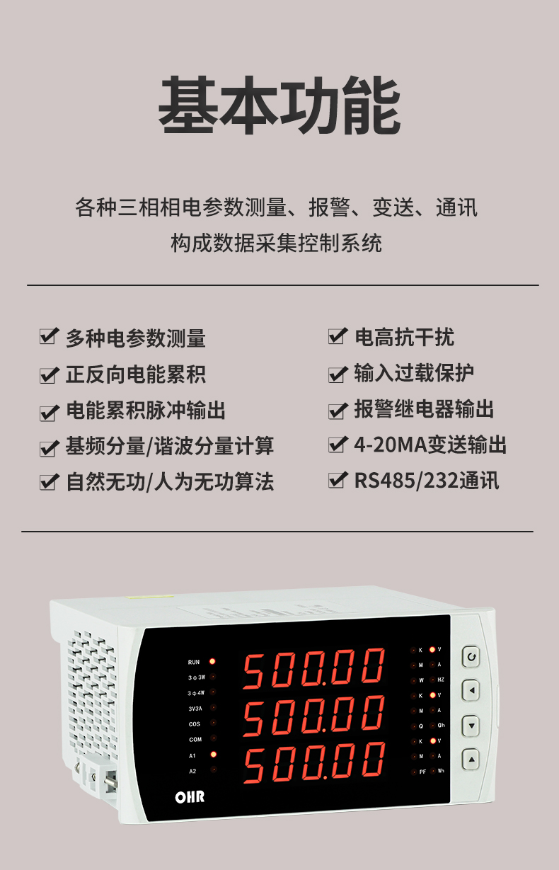 OHR-C300系列三相綜合電量表采用大規(guī)模集成電路和高亮度長(zhǎng)壽命的LED顯示器,應(yīng)用數(shù)字采樣技術(shù),對(duì)三相電氣線路中的相電壓、線電壓、相電流、線電流、有功功率、無(wú)功功率、視在功率、頻率、功率因數(shù)、等進(jìn)行實(shí)時(shí)測(cè)量顯示與控制。