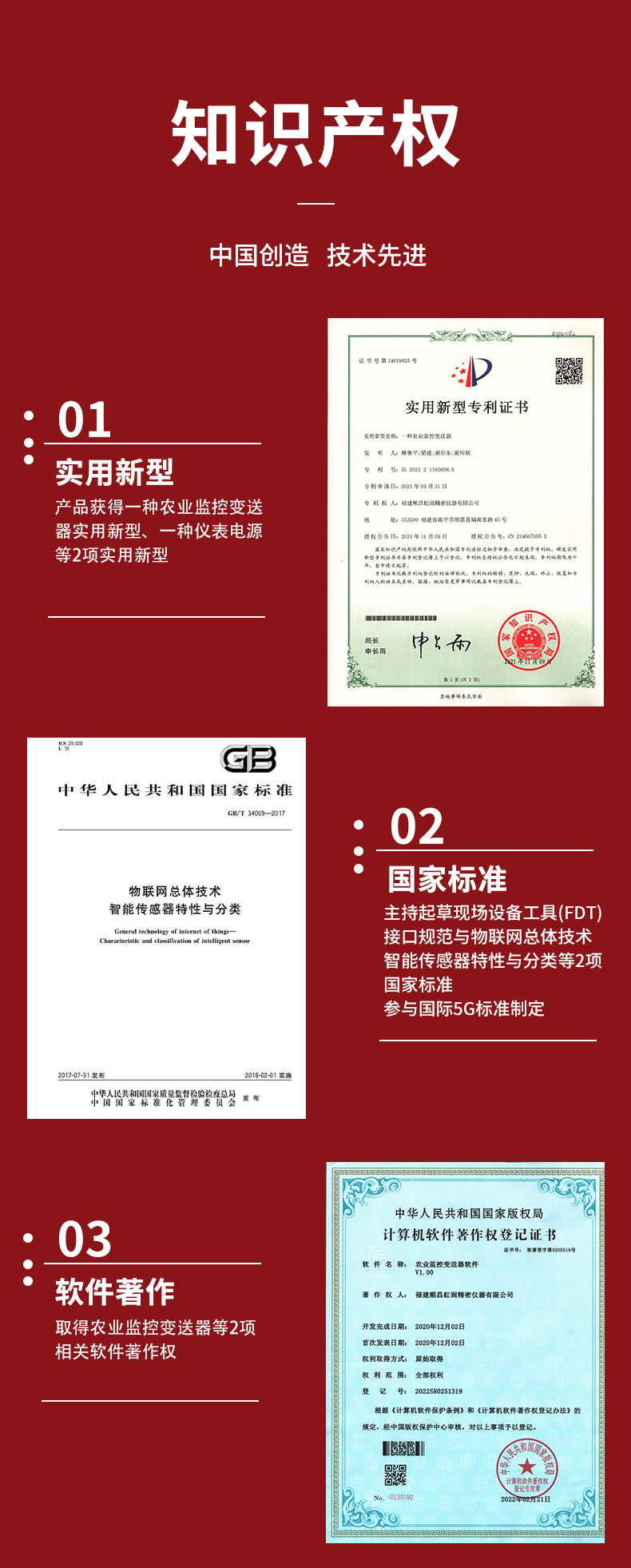 虹潤公司是專業生產環境監測儀表的國家專精特新“小巨人”企業。生產的二氧化碳變送器,具有新型紅外檢定技術,自動溫度補償,響應靈敏,低功耗,模擬量變送輸出或RS485通訊等特點。產品獲得一種農業監控變送器、一種儀表電源等2項實用新型專利,主持起草現場設備工具(FDT)接口規范、物聯網總體技術智能傳感器特性與分類等2項國家標準,參與國際5G標準制定,取得農業監測變送器等3項相關軟件著作權。產品廣泛應用于機房、配電站、地下車庫、工廠倉庫、食品儲存、養殖場、果蔬林園等環境場合對二氧化碳濃度的檢測。