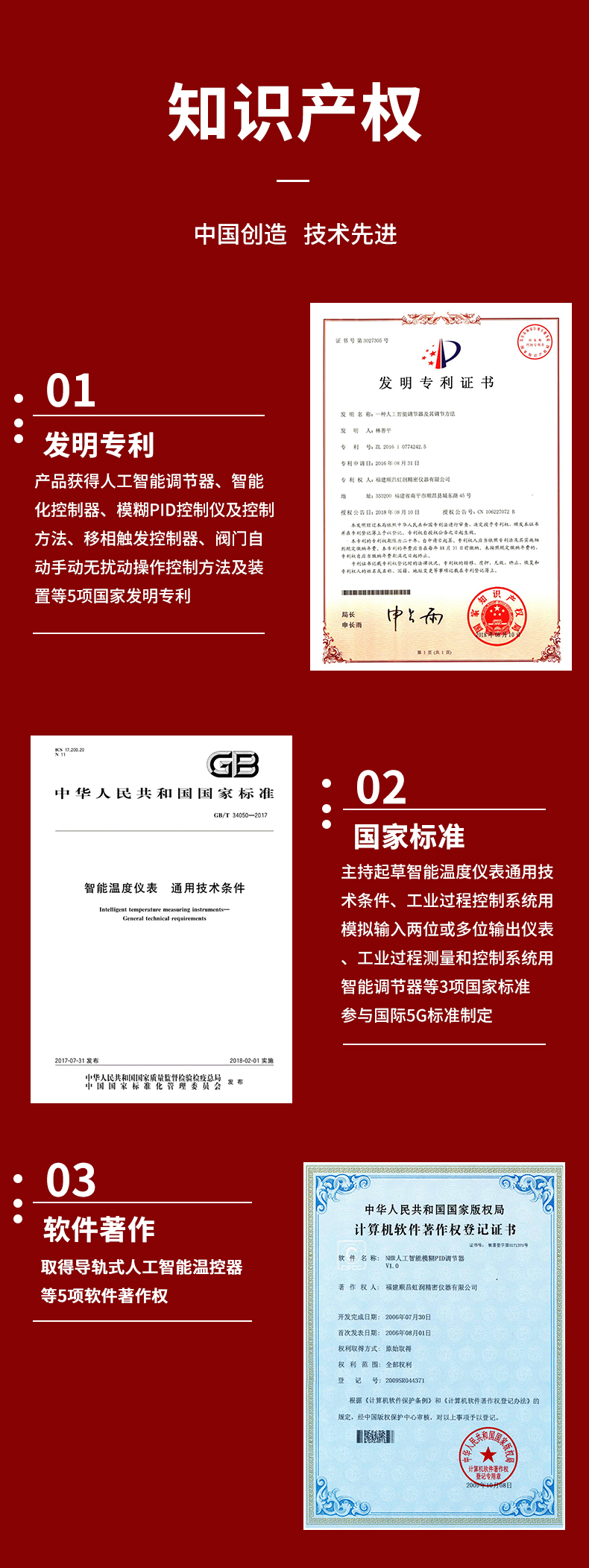 虹潤公司是專業生產溫控器的國家專精特新“小巨人”企業。生產的導軌式人工智能溫控器,具有真正人工智能算式,無需人工整定參數,控制精度可達±0.1°C,高抗干擾,帶485通訊輸出等特點。產品獲得人工智能調節器、智能化控制器、模糊PID控制儀及控制方法、移相觸發控制器、閥門自動手動無擾動操作控制方法及裝置等5項國家發明專利,主持起草智能溫度儀表通用技術條件、工業過程控制系統用模擬輸入兩位或多位輸出儀表、工業過程測量和控制系統用智能調節器等3項國家標準,參與國際5G標準制定,取得導軌式人工智能控制器等3項相關軟件著作權。產品廣泛應用于電力、石化,冶金、制藥、食品等幾乎所有工業現場,實現精準控溫,保障生產安全與質量。